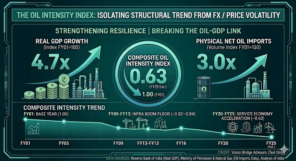 Compression: The Index has dropped from 1.00 in FY01 to 0.63 in FY25E—a 37% improvement in the oil-productivity of the economy.